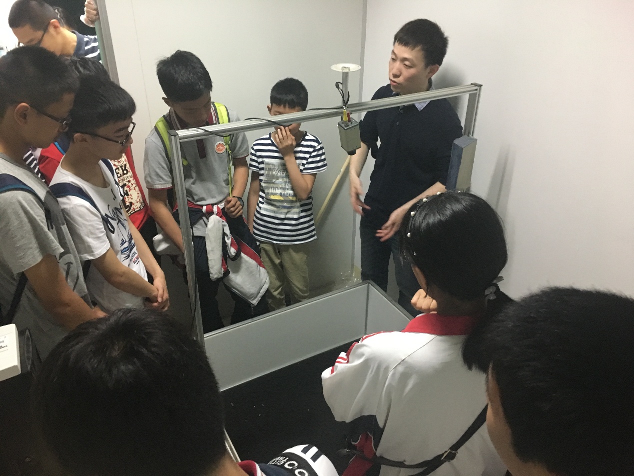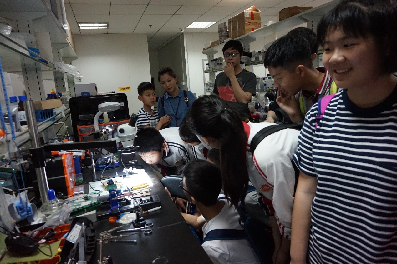 首先参观的是多通道电极制作的实验室。由实验室研究生为同学们介绍多通道记录技术中的微丝阵列电极的制作方法、工艺流程等等。同学们在显微镜下观察到了微丝阵列电极的尖端形态,微观结构。经过研究生的讲解,同学们明白了阵列电极工作的最基本原理。由于初中同学还未学习电学知识,不具备电学上的很多基础概念,研究生巧妙地类比气压的概念,让同学们理解了电压的定义以及电流的流向等科学问题。