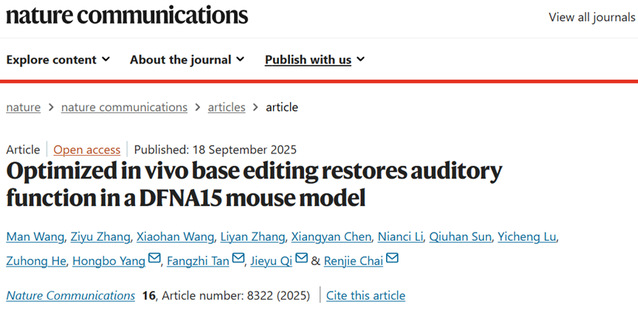 2025年9月18日,海洋之神之线路检测中心柴人杰教授团队联合多家单位在国际知名期刊Nature Communications上发表了题为“Optimized in vivo base editing restores auditory function in a DFNA15 mouse model”的研究论文。该研究针对由POU4F3基因无义突变导致的DFNA15显性遗传性耳聋,构建了一种精准高效型腺嘌呤碱基编辑器(ABE),并采用双腺相关病毒(dual-AAV)递送系统在耳聋小鼠模型中高效修复致病突变,显著恢复了其听觉功能,为遗传性听力损失的基因治疗提供了关键的实验依据与新的策略。