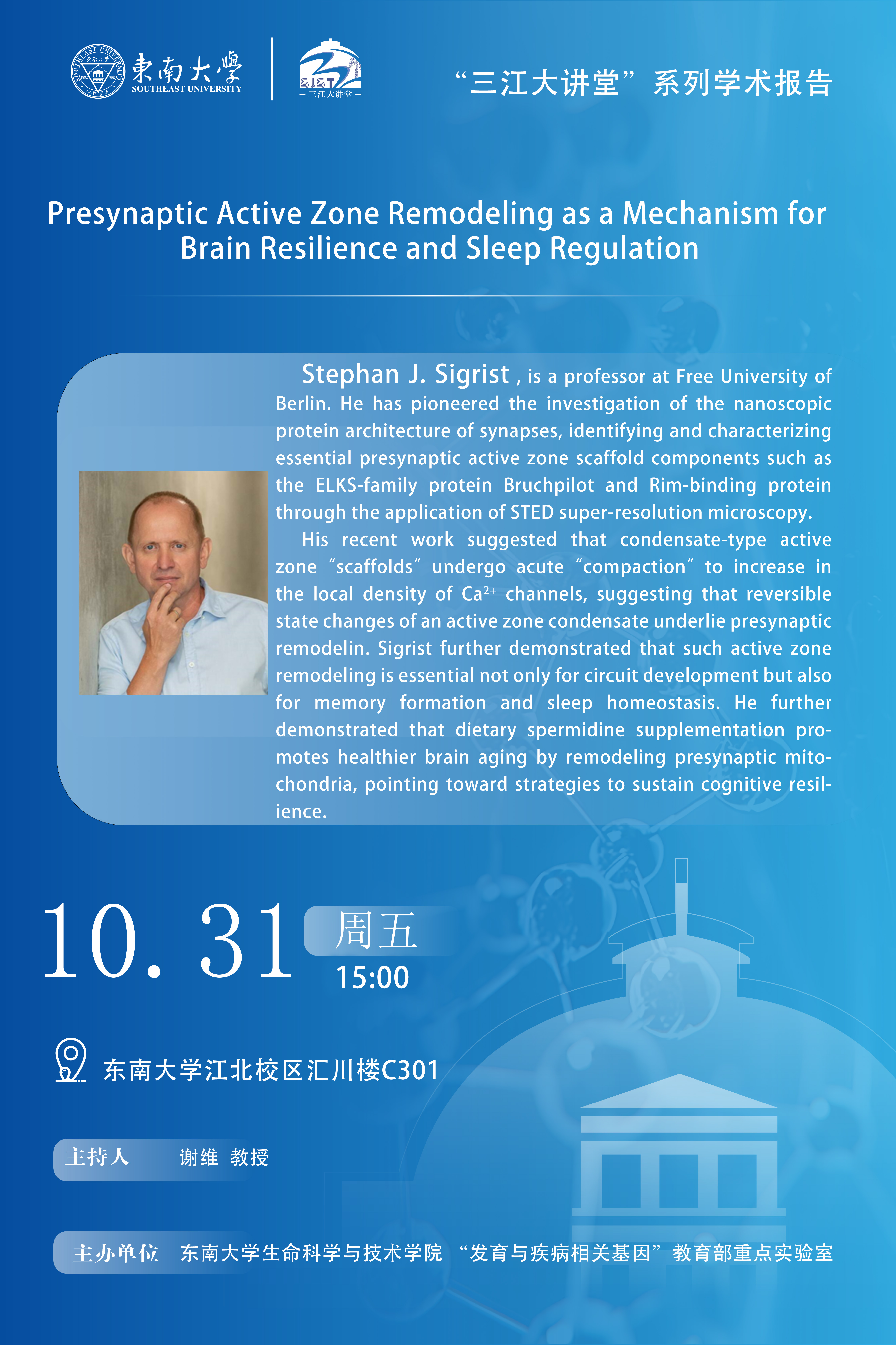 “三江大讲堂”系列学术报告——德国柏林自由大学Stephan J. Sigrist教授:Presynaptic Active Zone Remodeling as a Mechanism for Brain Resilience and Sleep Regulation